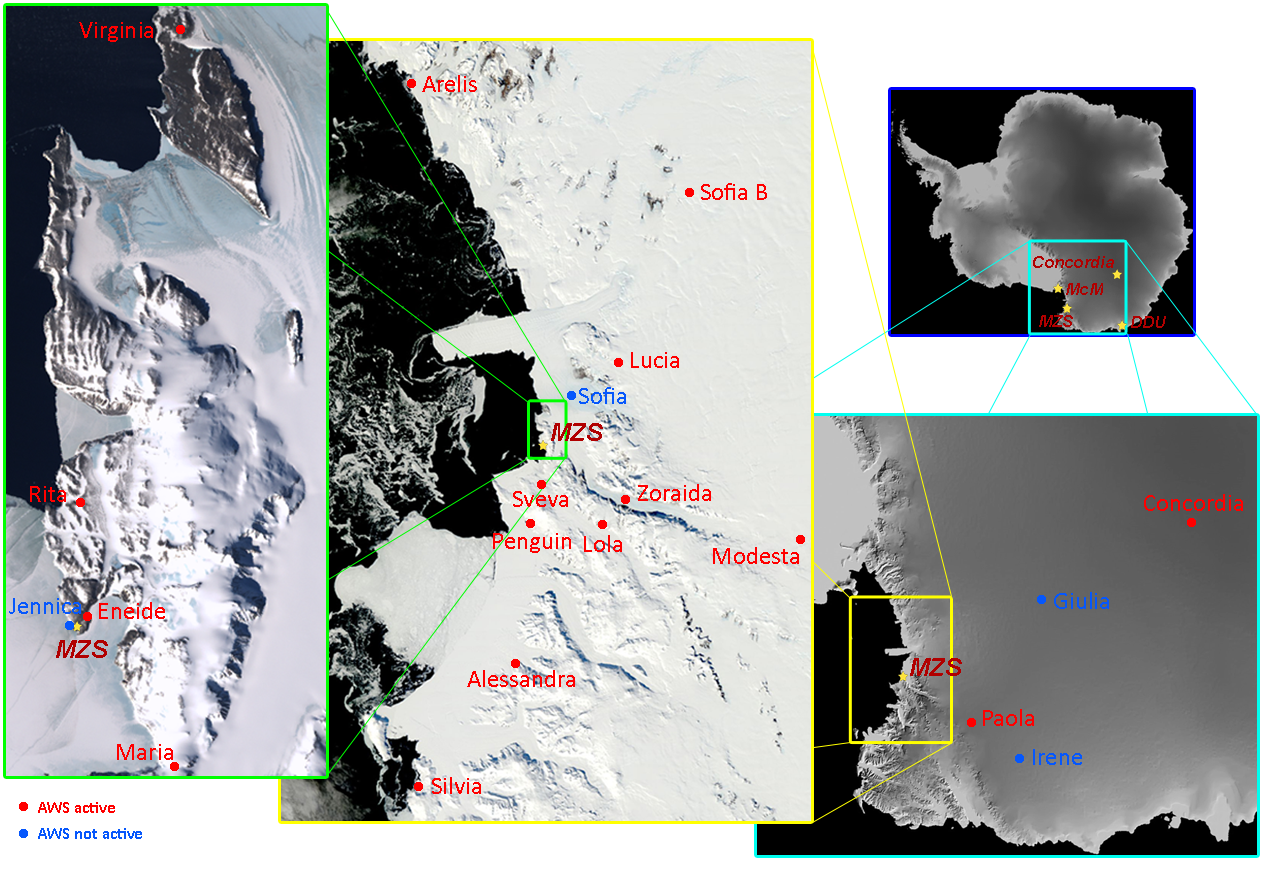 Currently the Observatory manages 20 AWS located over the region of Victoria Land and the Antarctic Plateau. 16 AWS are permanent and mainly used for scientific purposes, while the other 6 are used as support of flight operations and they are mounted only during the summer campaign.